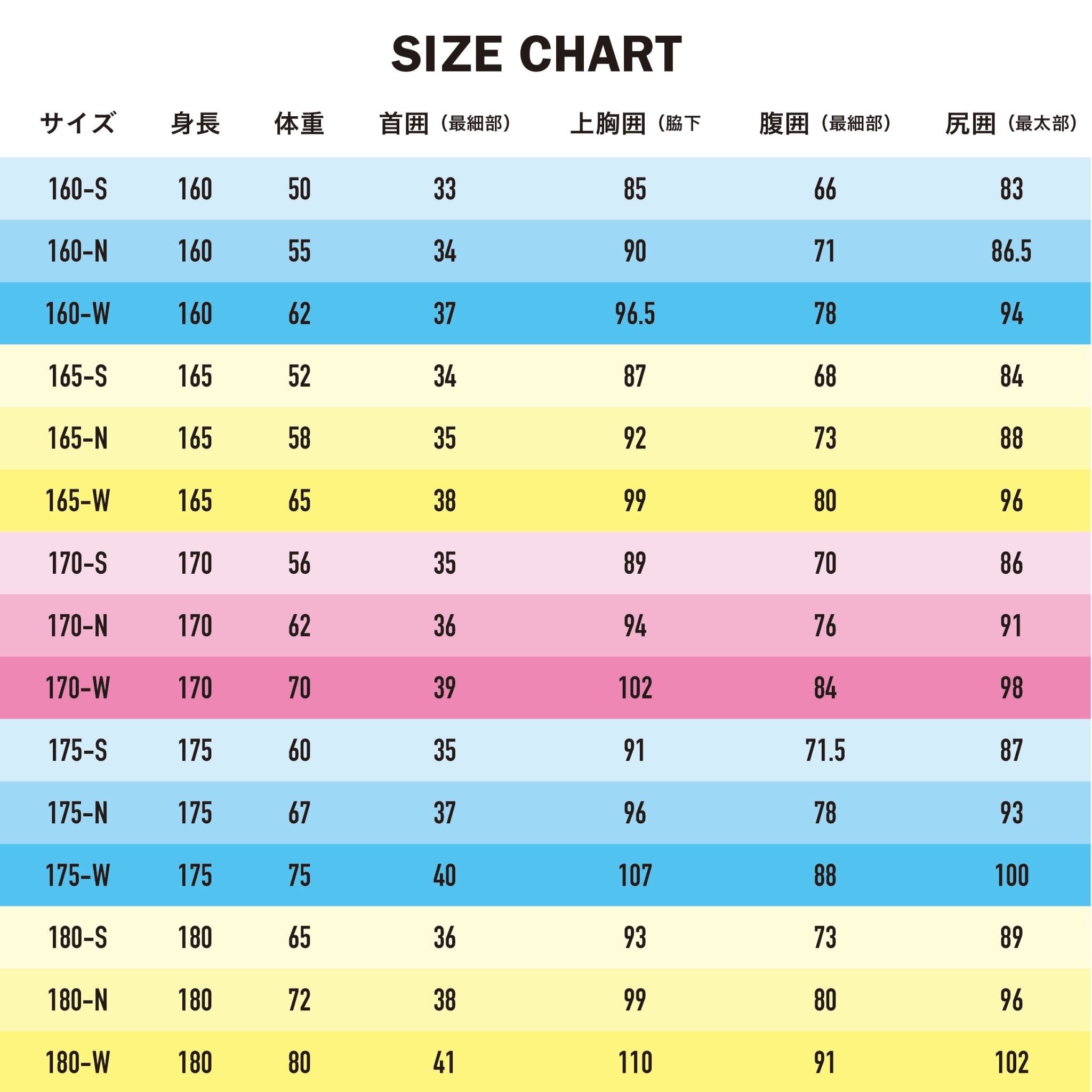 ※ 既成サイズの選び方でお勧めは自分の体重よりもオーバーサイズでお選びいただけますとフィットします。